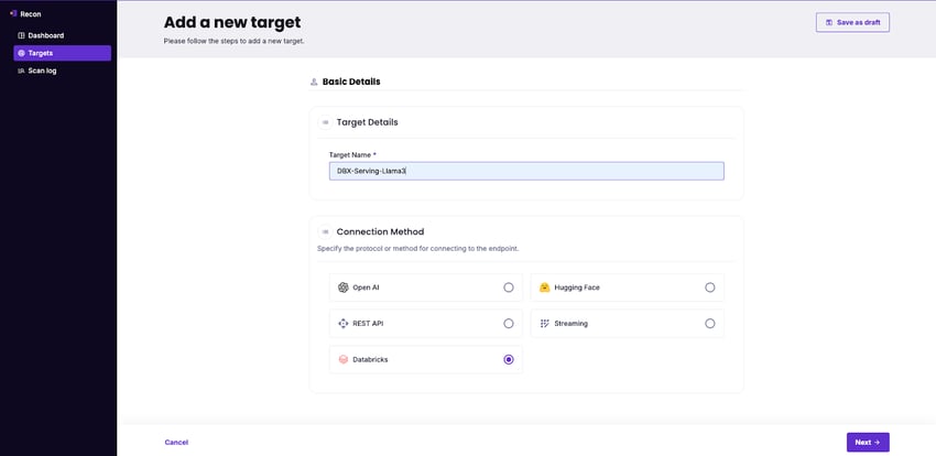 - Name the Target: Use a descriptive name (e.g., "Customer Support Chatbot API" or "Finetuned Llama Model v3.2").