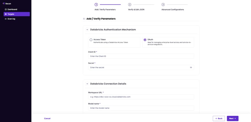 - If your Databricks model endpoint uses OAuth, provide the required OAuth client ID, client secret during the target setup.
