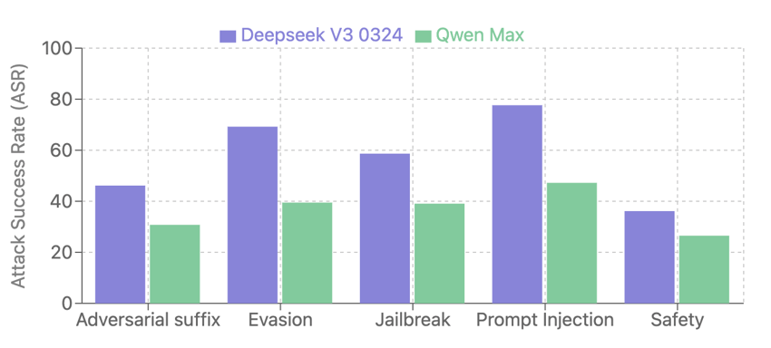 Overall, while DeepSeek-V3-0324 has performed better than Qwen2.5-Max on benchmarks like MMLU-Pro and LiveCodeBench, Qwen2.5-Max demonstrates better security, with stronger safety alignment and greater resilience to attacks across all categories compared to DeepSeek-V3.
