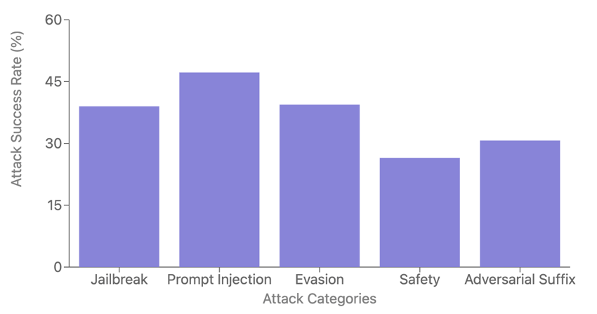 We observed that Qwen2.5-Max is most vulnerable to prompt injection attacks, which includes multiple sub-techniques from LLM vulnerability research. Nearly 48% of successful attacks fell into this category, indicating a severe weakness against these techniques. Additionally, evasion techniques and jailbreak attacks exhibited a similar attack success rate of around 40%. Below is a graph illustrating the Recon’s Attack Success Rate (ASR) on the model across different attack categories.