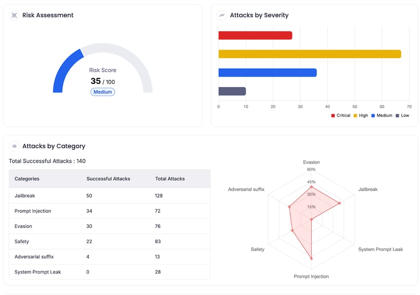 The model's performance against different attack categories is crucial, as it provides valuable insights into its different vulnerabilities and highlights the most effective attack techniques. This knowledge is essential for identifying weaknesses in your AI system and implementing effective mitigation strategies.